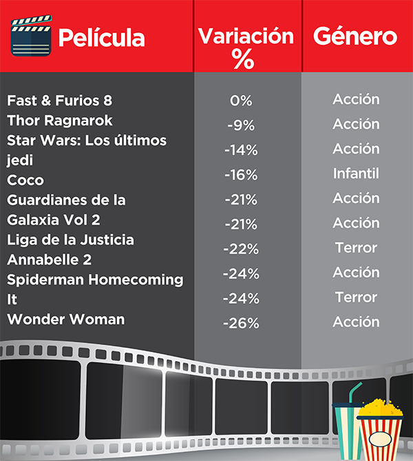 El Índice Pogen midió durante todo el año pasado el movimiento de personas en centros comerciales y para el análisis de las películas el Índice midió la afluencia de las personas durante una semana previa y otra posterior a sus respectivos estrenos, lo cual dió como resultado que durante el 2017 las películas de acción fueron las reinas, ya que fueron las principales causantes de que los centros comerciales, que tuvieran salas de cines, tuvieran muchas visitas y fueron las tiendas las que se percataron de esto las que pudieron sacarle el mejor provecho a los asistentes.